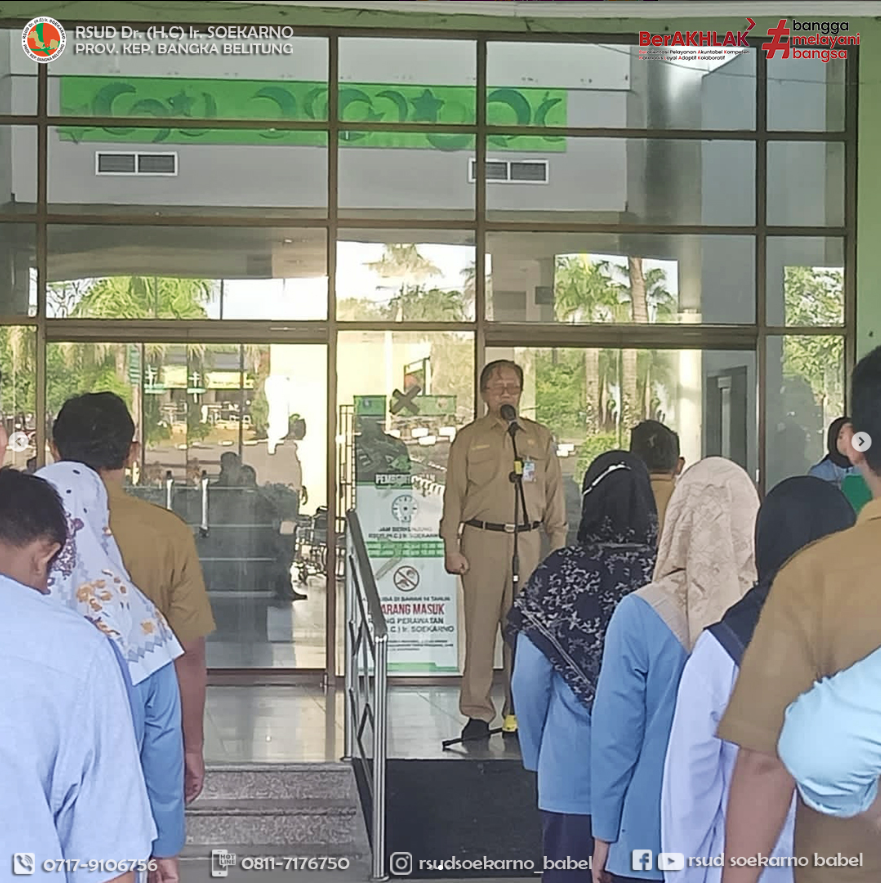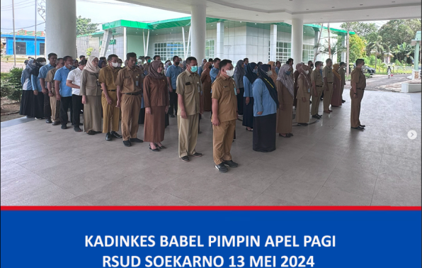 Pelaksanaan apel pagi yang dipimpin oleh Kepala Dinas Kesehatan Provinsi Kepulauan Bangka Belitung, dr. Andri Nurtito, MARS. Selaku pembina Apel Pagi, Kepala Dinas Kesehatan memberikan arahan kepada seluruh pegawai serta motivasi dalam bekerja demi kenyamanan masyarakat maupun pegawai, dan Kepala Dinas Kesehatan juga menegaskan kembali untuk meningkatkan pelayanan yang terbaik dari sarana prasarana dan sumber daya manusia yang ada di RSUD Dr. (H.C) Ir. Soekarno Provinsi Kepulauan Bangka Belitung.