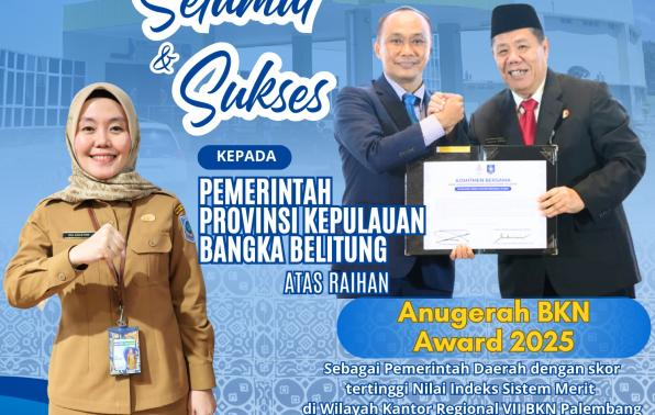 Pemerintah Provinsi Kepulauan Bangka Belitung menerima apresiasi Nilai Indeks Sistem Merit Tertinggi di Wilayah Kantor Regional BKN VII Palembang dan piagam penghargaan sebagai “Mitra Strategis Badan Kepegawaian Negara Republik Indonesia dalam Penyelenggaraan Manajemen ASN”.
