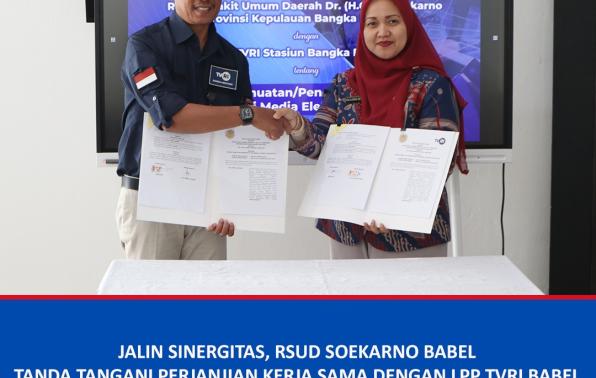 PANGKALPINANG - Meningkatkan sinergitas dengan insan media, Rumah Sakit Umum Daerah Dr. (H.C) Ir. Soekarno Provinsi Kepulauan Bangka Belitung (RSUD Soekarno Babel) melakukan Penandatanganan Perjanjian Kerja Sama Sinergi Pemuatan/Penerbitan Informasi di Media Elektronik dengan Lembaga Penyiaran Publik (LPP) TVRI Stasiun Bangka Belitung (TVRI Babel).